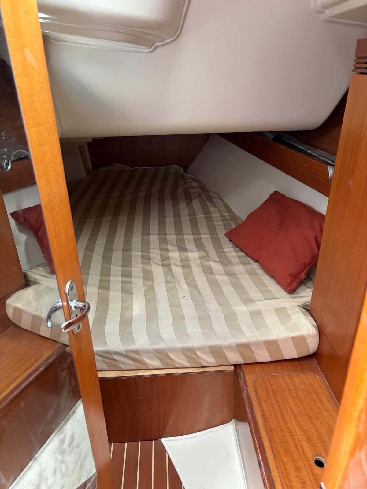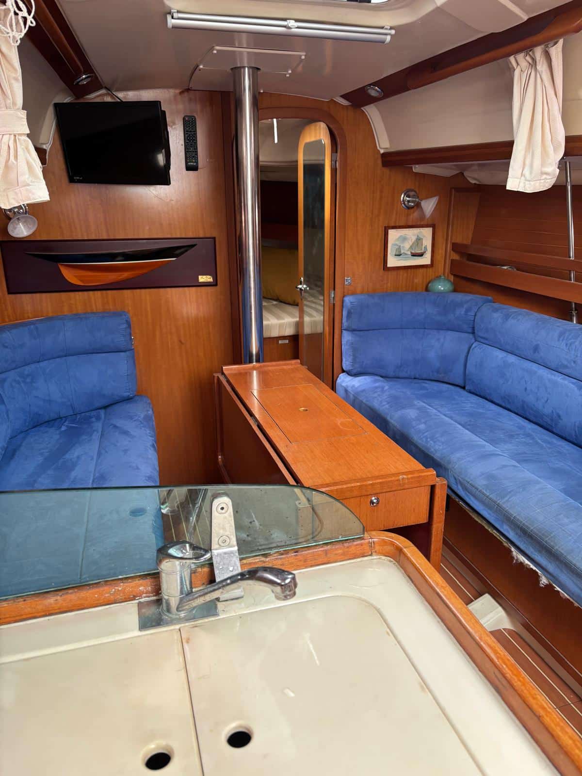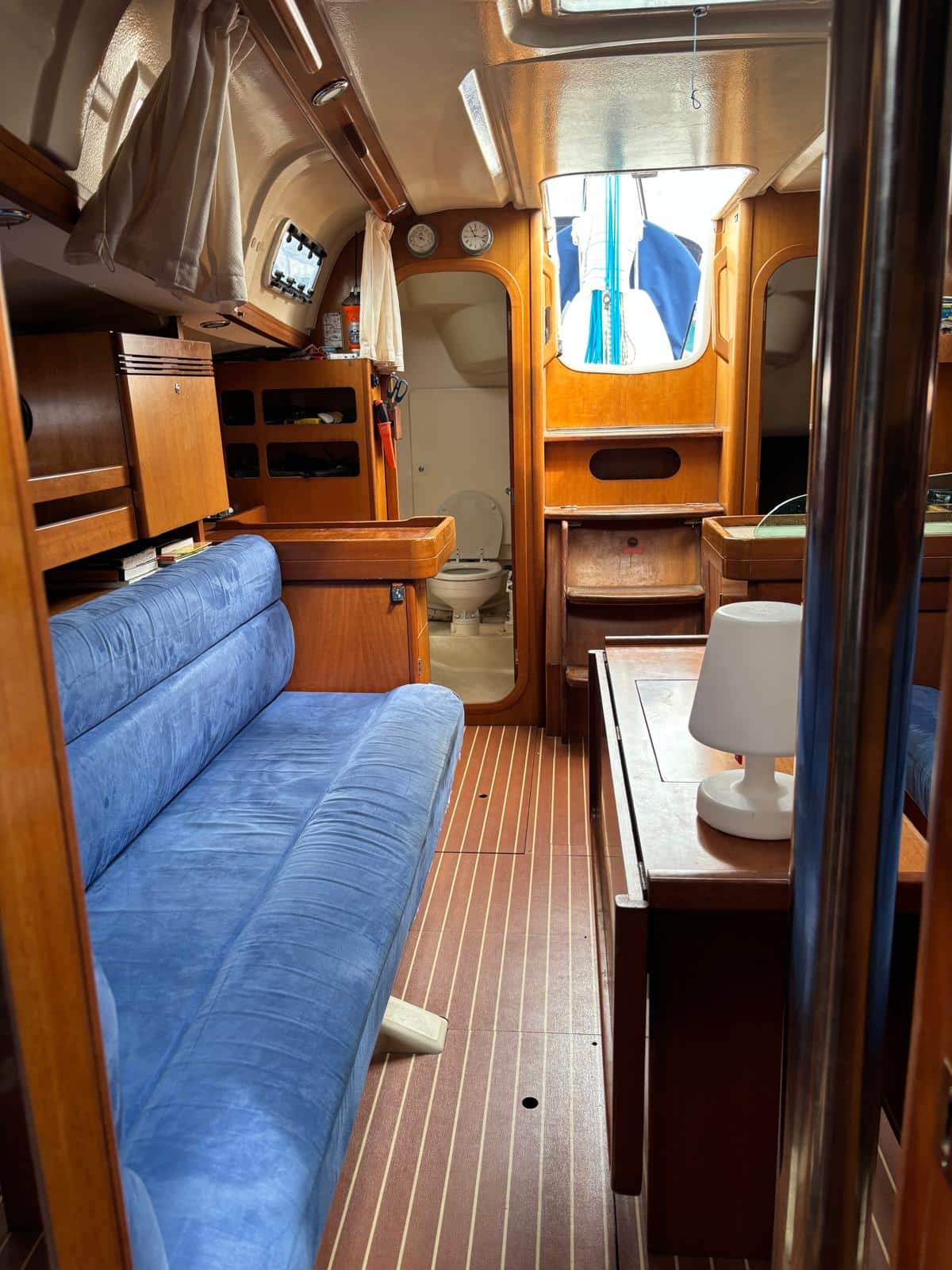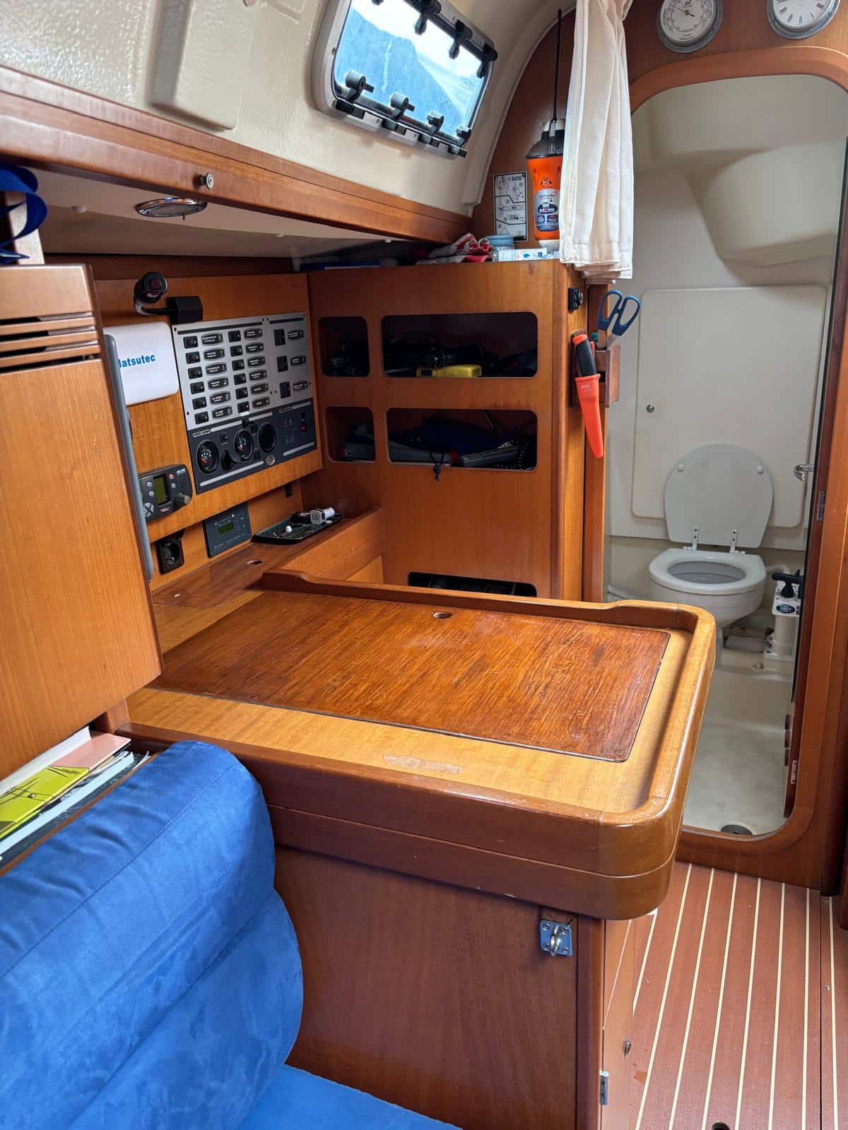 À l’intérieur, le voilier privilégie la fonctionnalité et le confort. Il dispose généralement de deux cabines doubles, d’un carré transformable et d’une salle d’eau, permettant d’accueillir entre 4 et 6 personnes dans de bonnes conditions. Les aménagements en bois apportent une ambiance chaleureuse, tandis que l’ergonomie du carré et de la cuisine rend la vie à bord agréable lors des croisières