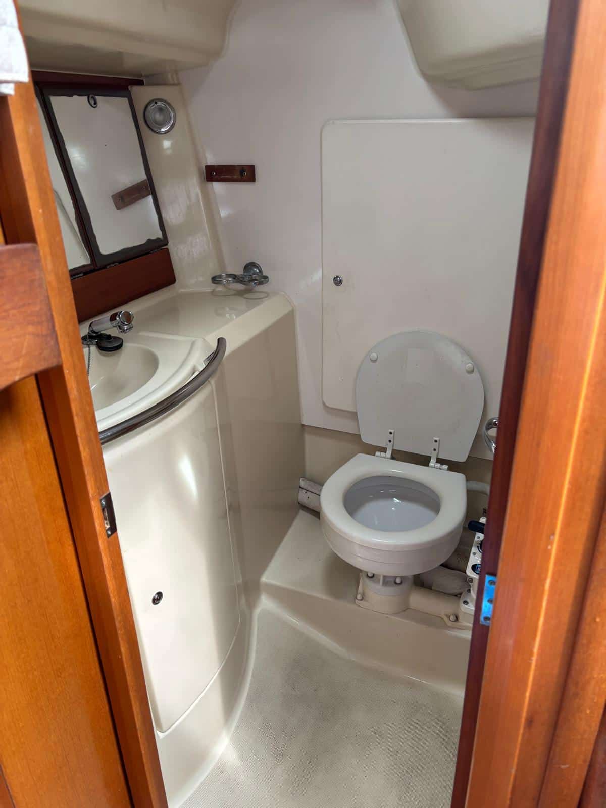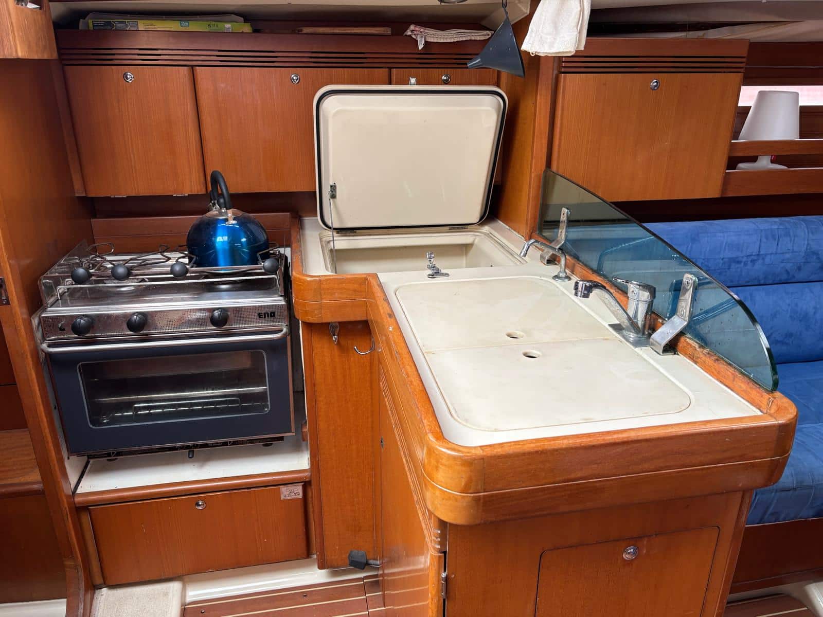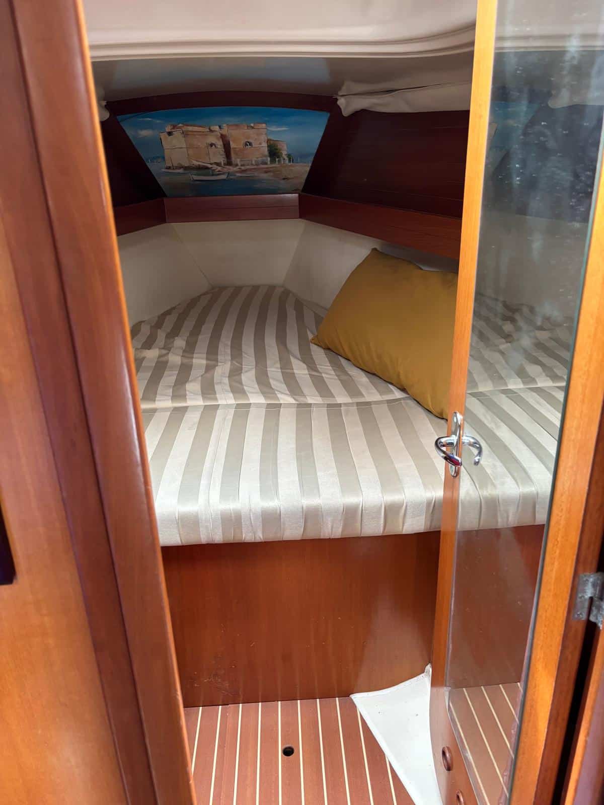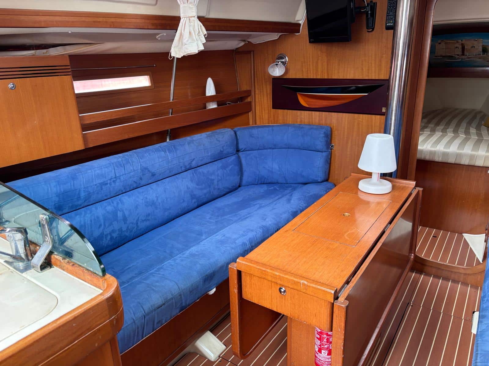 À l’intérieur, le voilier privilégie la fonctionnalité et le confort. Il dispose généralement de deux cabines doubles, d’un carré transformable et d’une salle d’eau, permettant d’accueillir entre 4 et 6 personnes dans de bonnes conditions. Les aménagements en bois apportent une ambiance chaleureuse, tandis que l’ergonomie du carré et de la cuisine rend la vie à bord agréable lors des croisières
