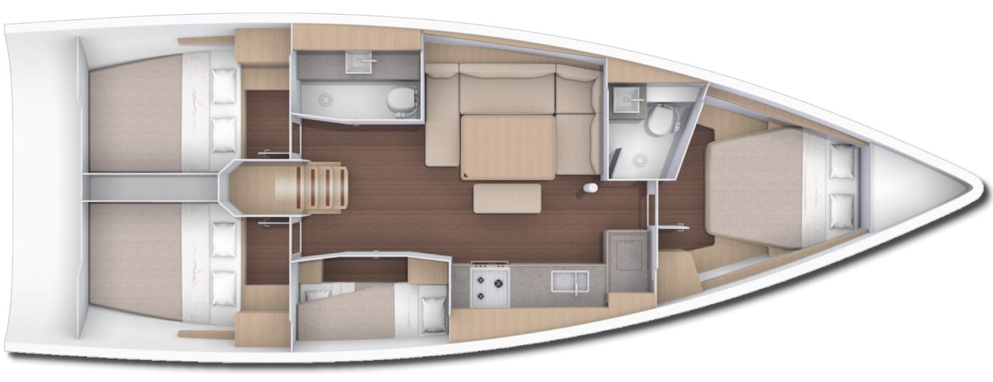 - 4 cabines, 2 salles de bain, 3 cabines doubles et 1 pullman + carre transformable